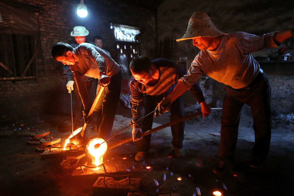 鐵花飛濺,鐵流滾滾的鑄造廠里,一股熱浪襲來,閃著千余度火焰的鐵水照紅了整個車間,工人們已經在高溫下重復了持續(xù)幾個小時的工序,他們將土填入事先制作好的模具中并進行夯實,預留澆鑄口和通氣孔,再澆鑄。